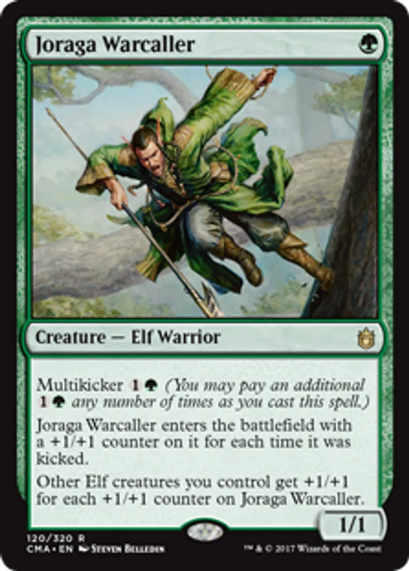 | Oracle Text | Multikicker {{1}}{{g}} (You may pay an additional {{1}}{{g}} any number of times as you cast this spell.) Joraga Warcaller enters the battlefield with a +1/+1 counter on it for each time it was kicked. Other Elf creatures you control get +1/+1 for each +1/+1 counter on Joraga Warcaller. | ||