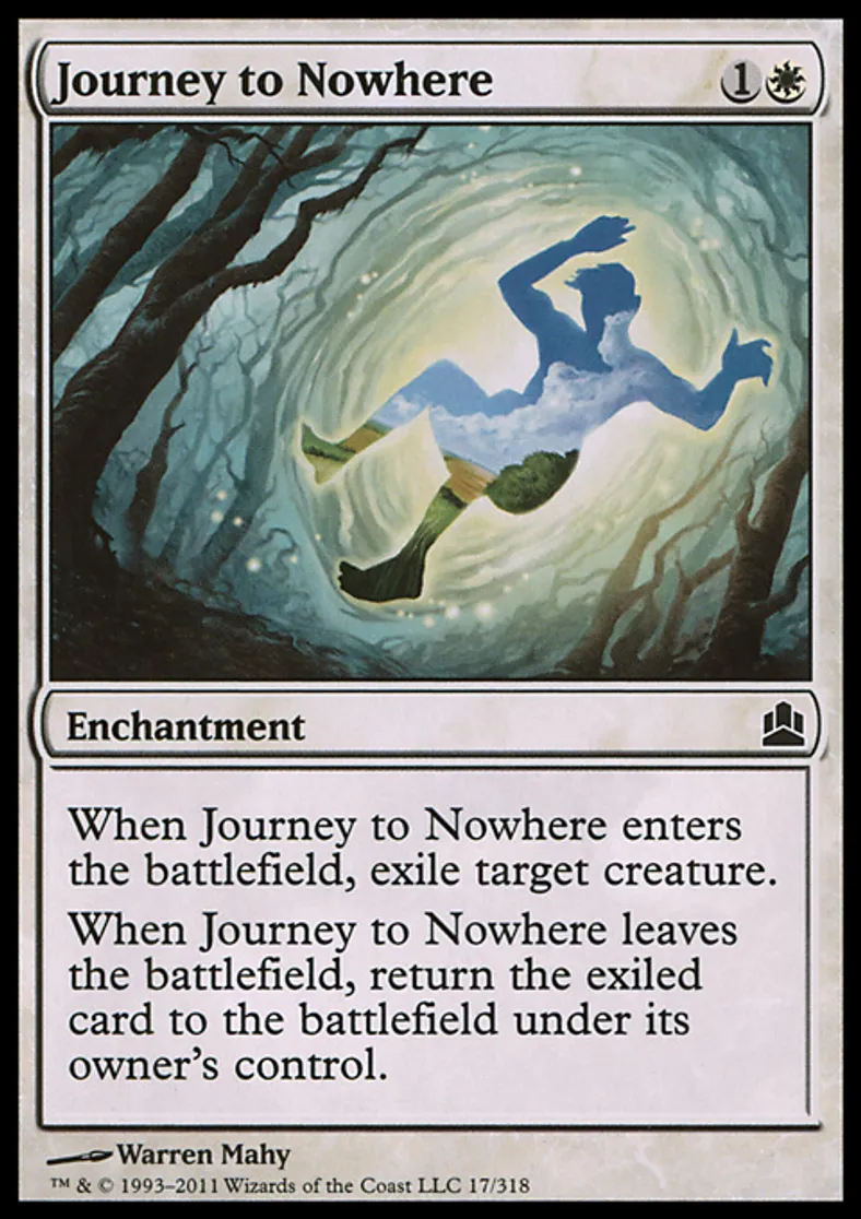 | Oracle Text | When Journey to Nowhere enters the battlefield, exile target creature. When Journey to Nowhere leaves the battlefield, return the exiled card to the battlefield under its owner's control. | ||
