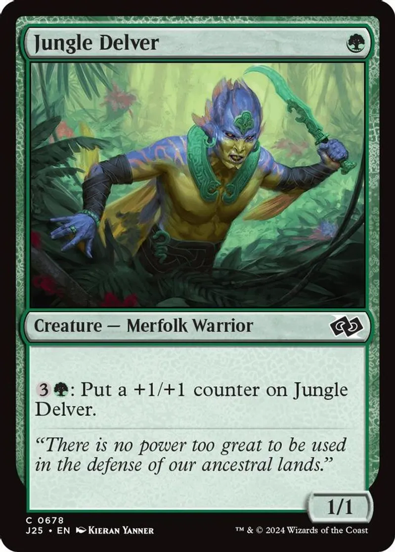 Magic: the Gathering (mtg) Common creature — merfolk warrior Jungle Delver from Foundations Jumpstart (J25) last updated 2026-04-11 15:35:04