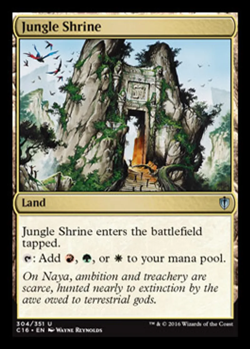 | Oracle Text | Jungle Shrine enters the battlefield tapped. {{t}}: Add {{r}}, {{g}}, or {{w}} to your mana pool. | ||