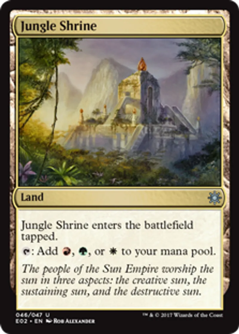 | Oracle Text | Jungle Shrine enters the battlefield tapped. {{t}}: Add {{r}}, {{g}}, or {{w}} to your mana pool. | ||