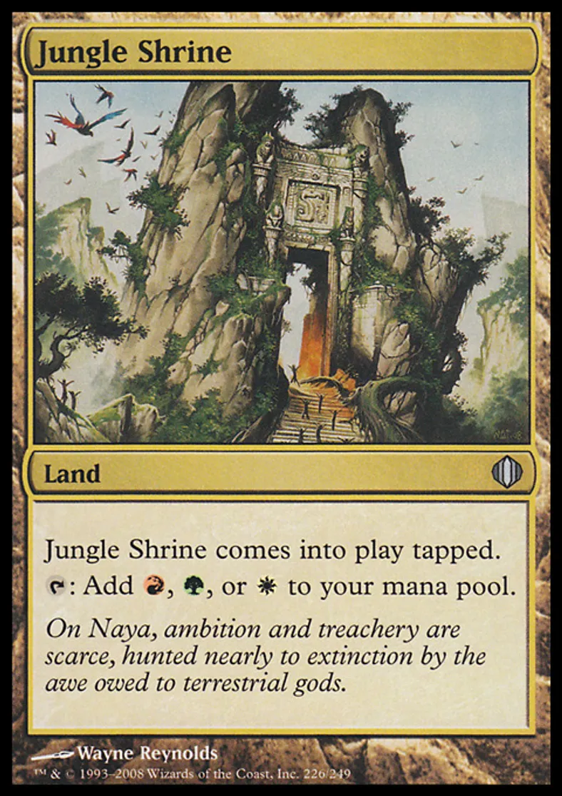 | Oracle Text | Jungle Shrine enters the battlefield tapped. {{t}}: Add {{r}}, {{g}}, or {{w}} to your mana pool. | ||
