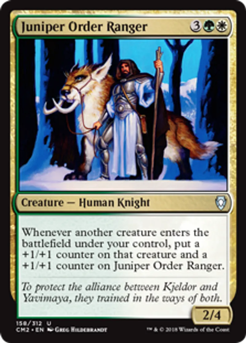 | Oracle Text | Whenever another creature enters the battlefield under your control, put a +1/+1 counter on that creature and a +1/+1 counter on Juniper Order Ranger. | ||