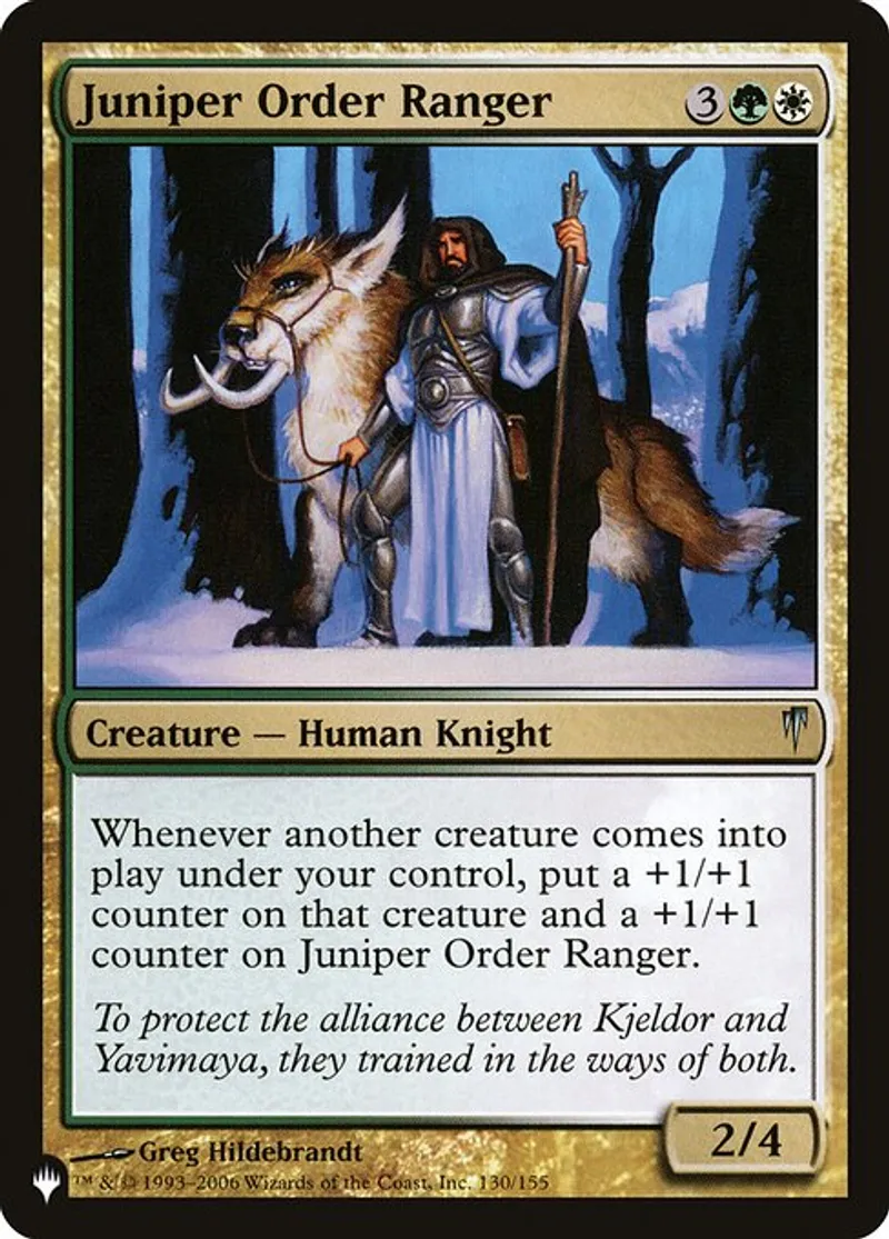 | Oracle Text | Whenever another creature enters the battlefield under your control, put a +1/+1 counter on that creature and a +1/+1 counter on Juniper Order Ranger. | ||