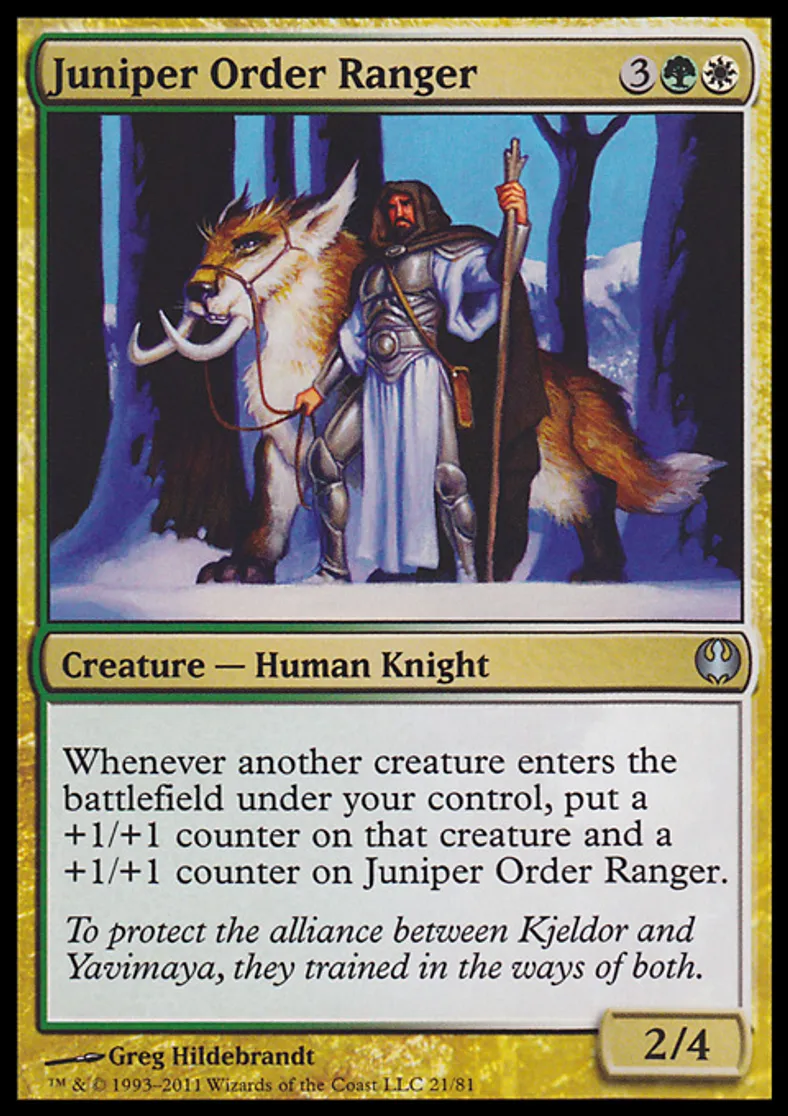 | Oracle Text | Whenever another creature enters the battlefield under your control, put a +1/+1 counter on that creature and a +1/+1 counter on Juniper Order Ranger. | ||