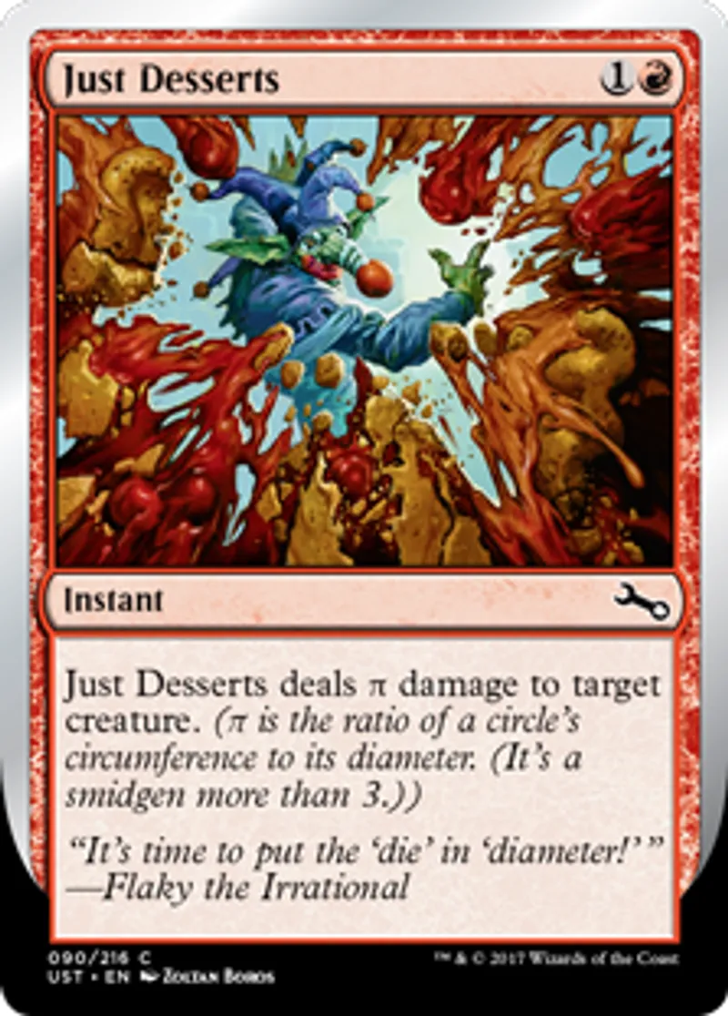 | Oracle Text | Just Desserts deals π damage to target creature. (π is the ratio of a circle's circumference to its diameter. (It's a smidgen more than 3.)) | ||
