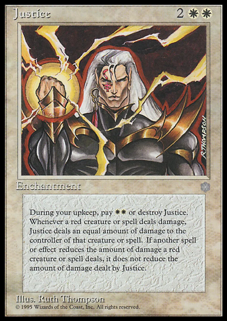 | Oracle Text | At the beginning of your upkeep, sacrifice Justice unless you pay {{w}}{{w}}. Whenever a red creature or spell deals damage, Justice deals that much damage to that creature's or spell's controller. | ||