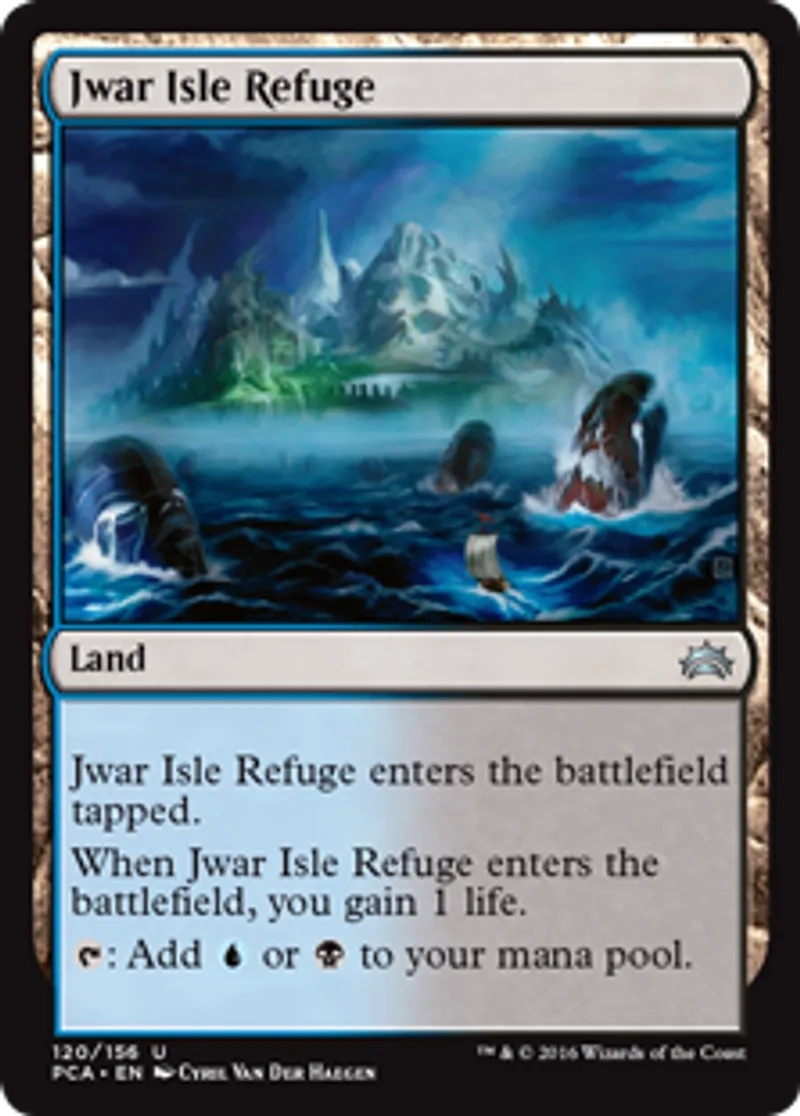 | Oracle Text | Jwar Isle Refuge enters the battlefield tapped. When Jwar Isle Refuge enters the battlefield, you gain 1 life. {{t}}: Add {{u}} or {{b}} to your mana pool. | ||