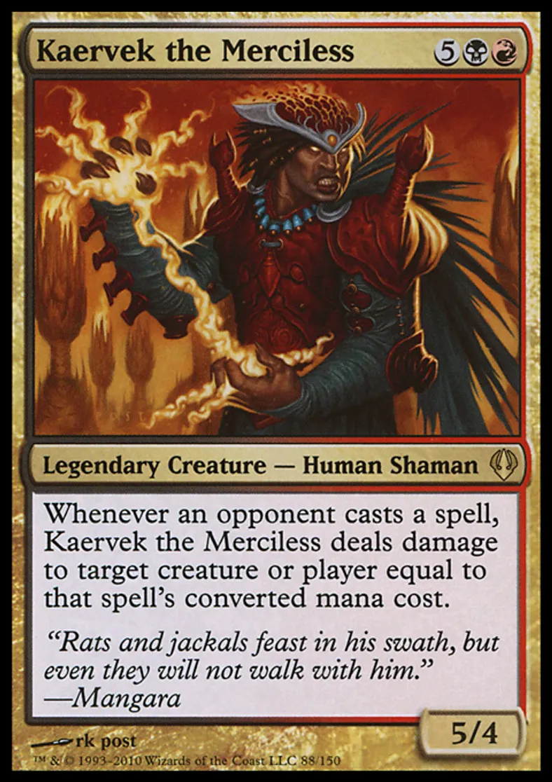| Oracle Text | Whenever an opponent casts a spell, Kaervek the Merciless deals damage to target creature or player equal to that spell's converted mana cost. | ||