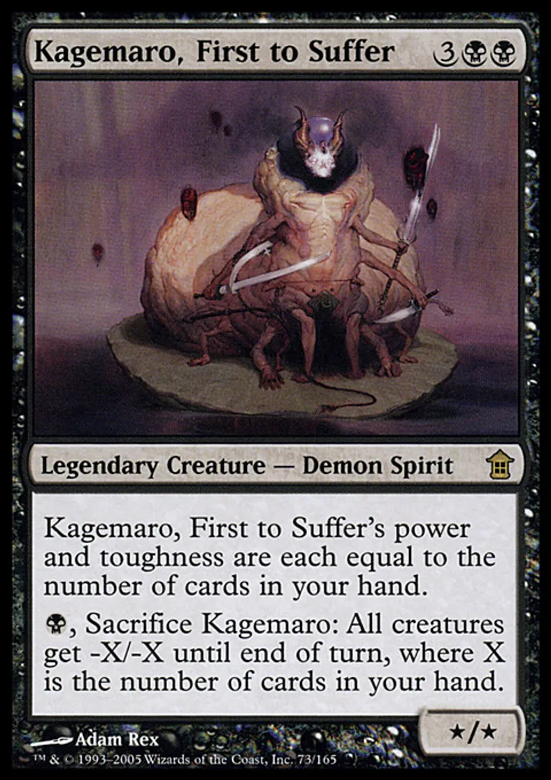 | Oracle Text | Kagemaro, First to Suffer's power and toughness are each equal to the number of cards in your hand. {{b}}, Sacrifice Kagemaro: All creatures get -X/-X until end of turn, where X is the number of cards in your hand. | ||