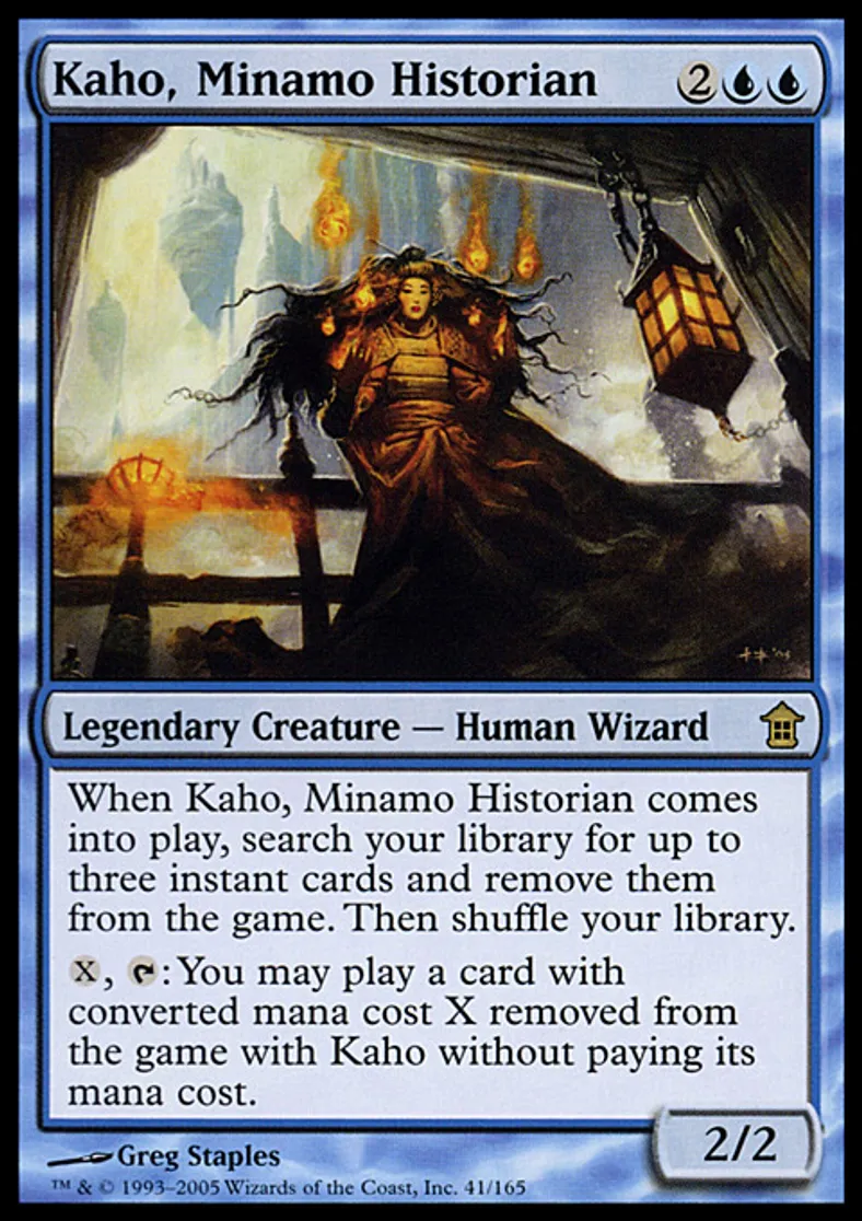 | Oracle Text | When Kaho, Minamo Historian enters the battlefield, search your library for up to three instant cards and exile them. Then shuffle your library. {{x}}, {{t}}: You may cast a card with converted mana cost X exiled with Kaho without paying its mana cost. | ||