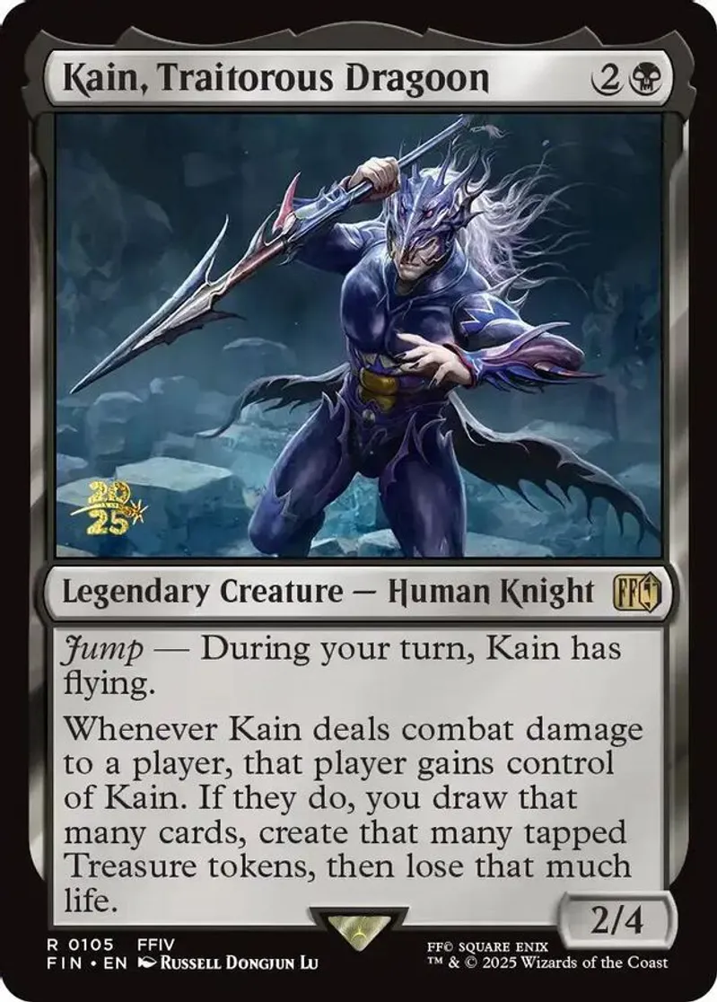 whenever kain deals combat damage to a player, that player gains control of kain. if they do, you draw that many cards, create that many tapped treasure tokens, then lose that much life. | ||