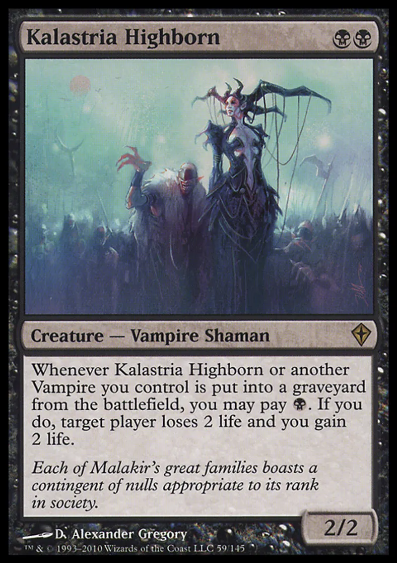 | Oracle Text | Whenever Kalastria Highborn or another Vampire you control dies, you may pay {{b}}. If you do, target player loses 2 life and you gain 2 life. | ||