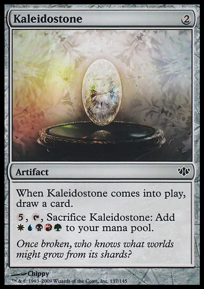 | Oracle Text | When Kaleidostone enters the battlefield, draw a card. {{5}}, {{t}}, Sacrifice Kaleidostone: Add {{w}}{{u}}{{b}}{{r}}{{g}} to your mana pool. | ||