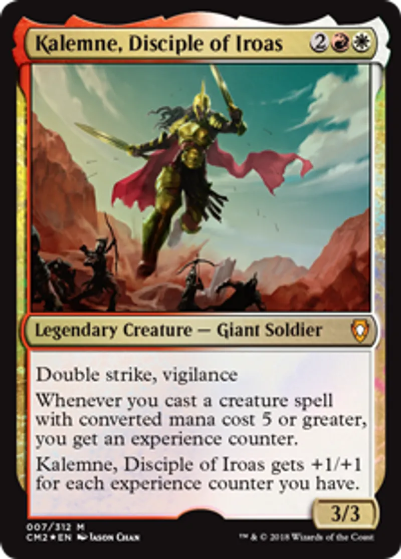 | Oracle Text | Double strike, vigilance Whenever you cast a creature spell with converted mana cost 5 or greater, you get an experience counter. Kalemne, Disciple of Iroas gets +1/+1 for each experience counter you have. | ||