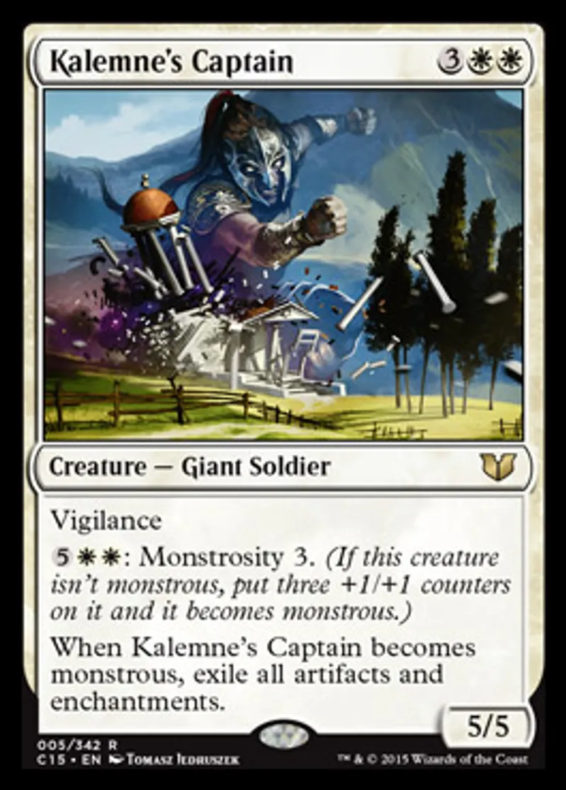 | Oracle Text | Vigilance {{5}}{{w}}{{w}}: Monstrosity 3. (If this creature isn't monstrous, put three +1/+1 counters on it and it becomes monstrous.) When Kalemne's Captain becomes monstrous, exile all artifacts and enchantments. | ||