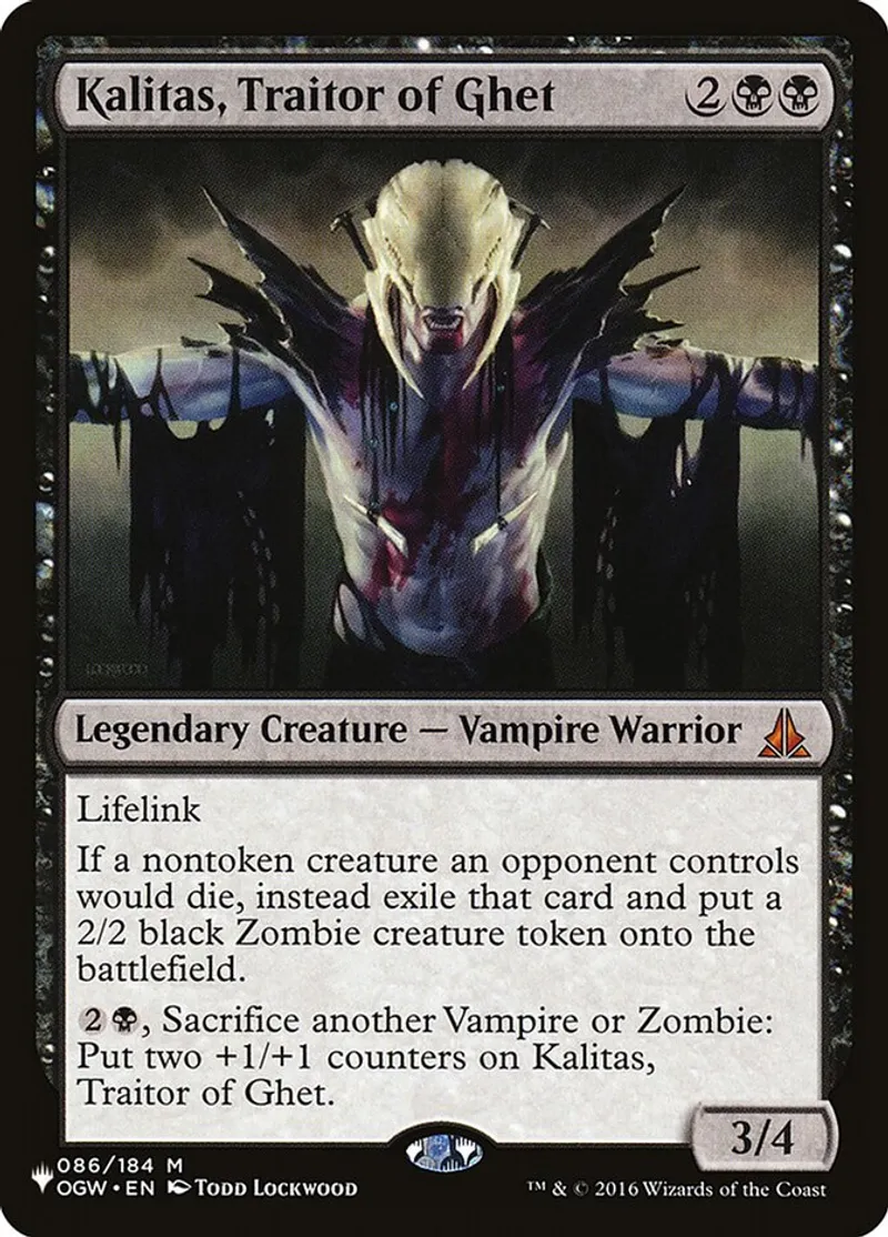 Magic: the Gathering (mtg) Mythic Rare Legendary Creature — Vampire Warrior Kalitas, Traitor of Ghet from The List (PLIST) last updated 2026-02-25 14:30:07