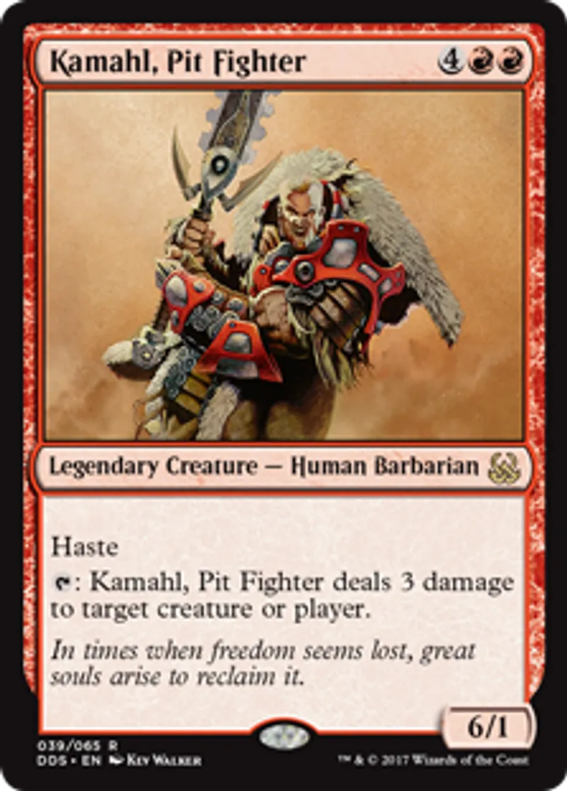 | Oracle Text | Haste (This creature can attack and {{t}} as soon as it comes under your control.) {{t}}: Kamahl, Pit Fighter deals 3 damage to target creature or player. | ||