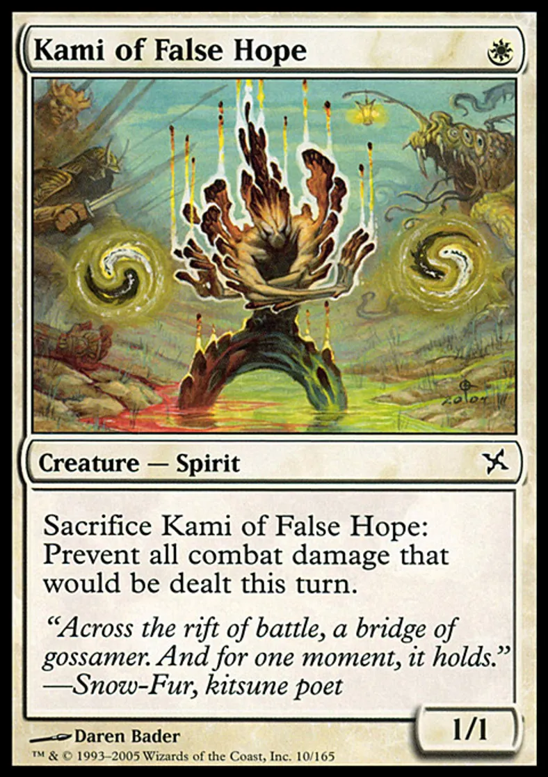 | Oracle Text | Sacrifice Kami of False Hope: Prevent all combat damage that would be dealt this turn. | ||