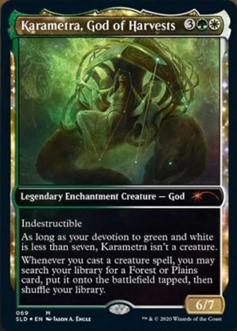 Magic: the Gathering (mtg) Mythic Rare Legendary Enchantment Creature - God Karametra, God of Harvests from Secret Lair Drop Series (SLD) last updated 2026-02-24 15:26:06