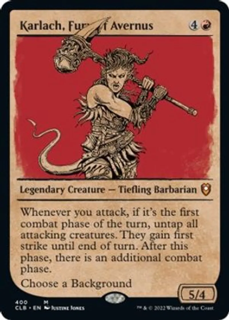 Magic: the Gathering (mtg) Mythic Rare Legendary Creature — Tiefling Barbarian Karlach, Fury of Avernus from Commander Legends: Battle for Baldur's Gate (CLB) last updated 2026-02-24 15:37:02