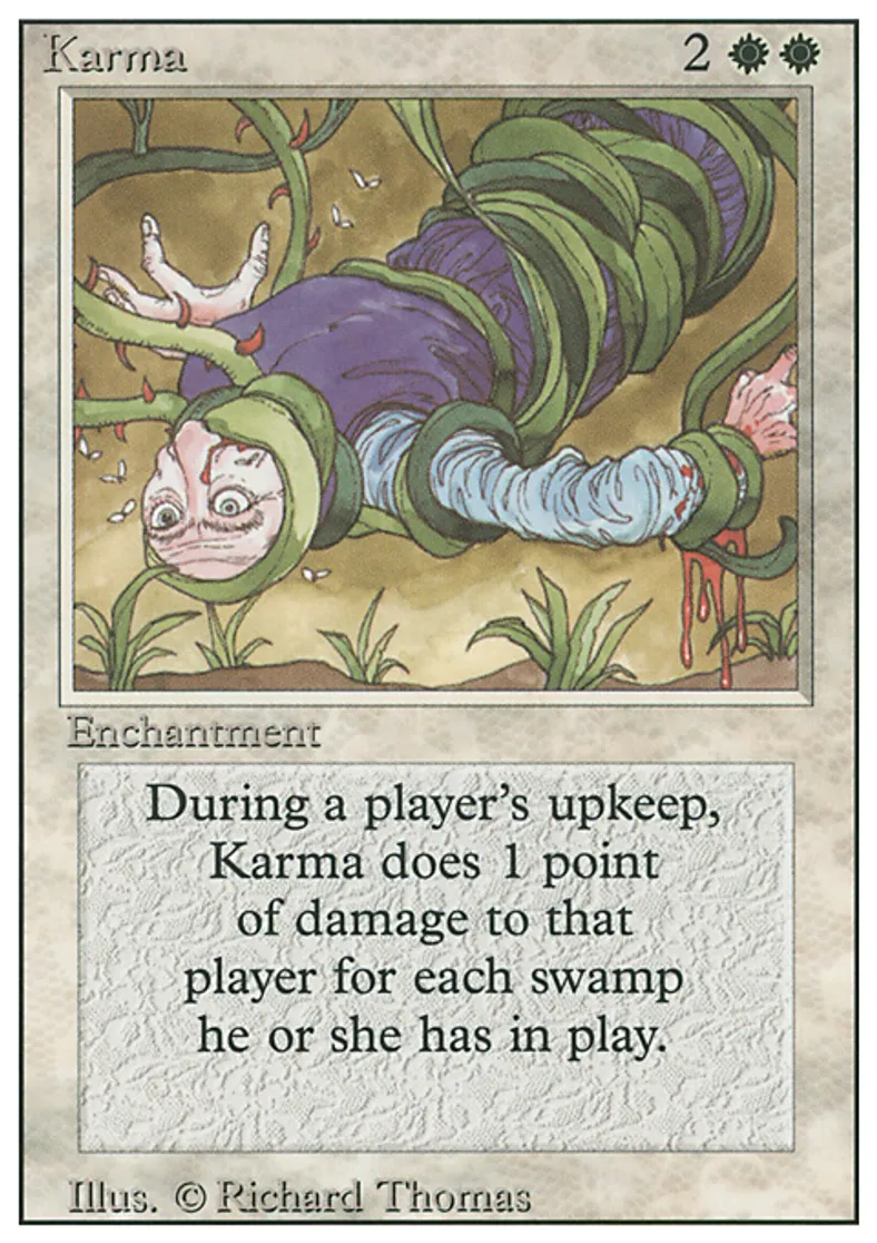 | Oracle Text | At the beginning of each player's upkeep, Karma deals damage to that player equal to the number of Swamps he or she controls. | ||