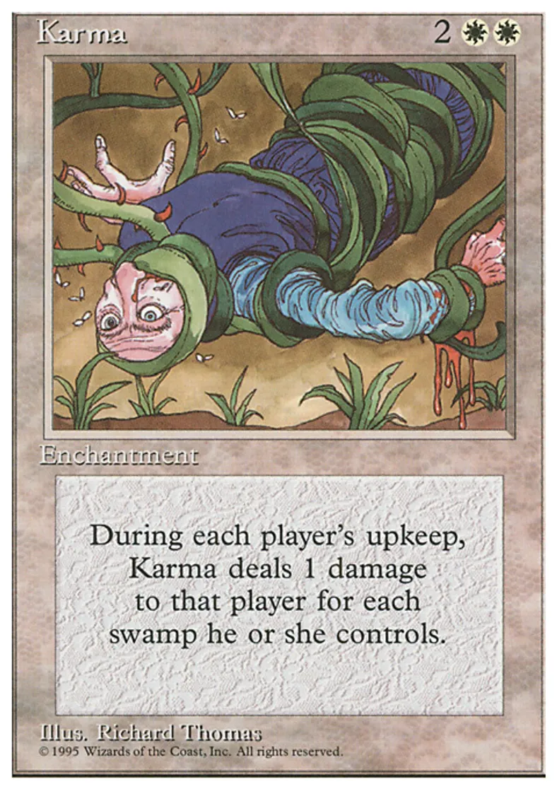 | Oracle Text | At the beginning of each player's upkeep, Karma deals damage to that player equal to the number of Swamps he or she controls. | ||