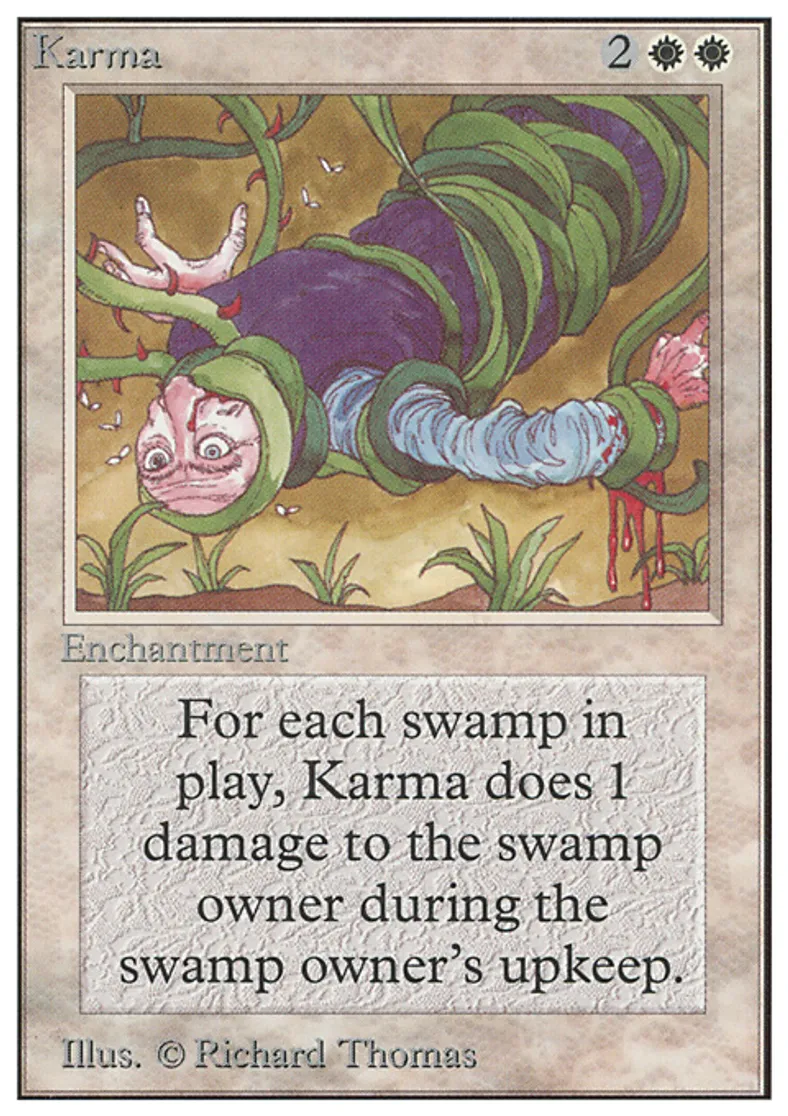 | Oracle Text | At the beginning of each player's upkeep, Karma deals damage to that player equal to the number of Swamps he or she controls. | ||
