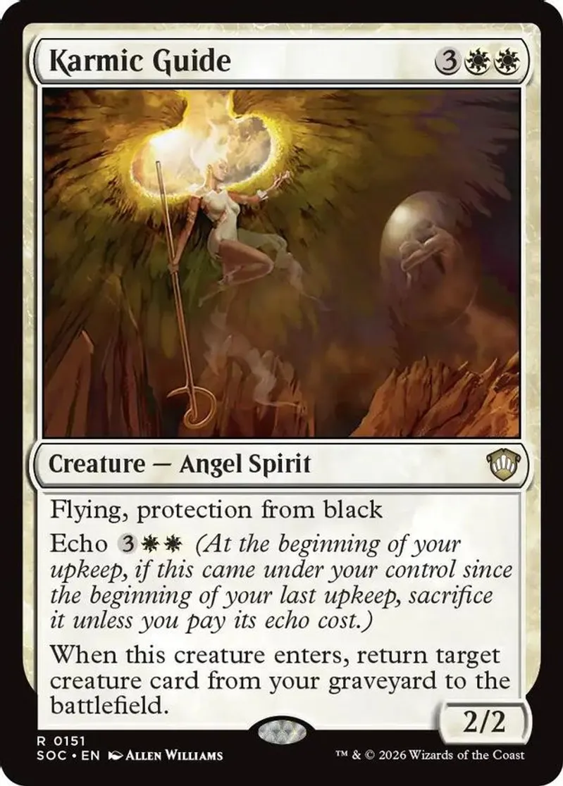 Magic: the Gathering (mtg) Rare creature — angel spirit Karmic Guide from Commander: Secrets of Strixhaven (SOC) last updated 2026-04-20 15:37:05