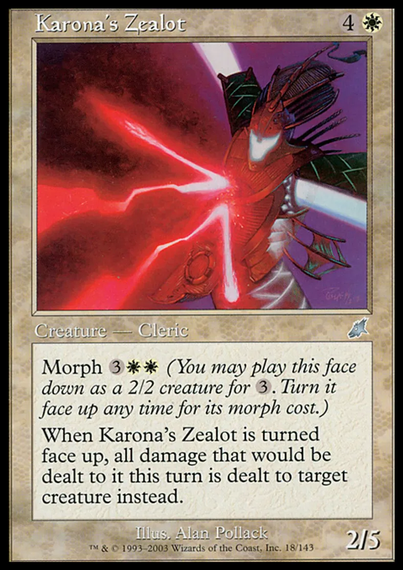 | Oracle Text | Morph {{3}}{{w}}{{w}} (You may cast this face down as a 2/2 creature for {{3}}. Turn it face up any time for its morph cost.) When Karona's Zealot is turned face up, all damage that would be dealt to it this turn is dealt to target creature instead. | ||