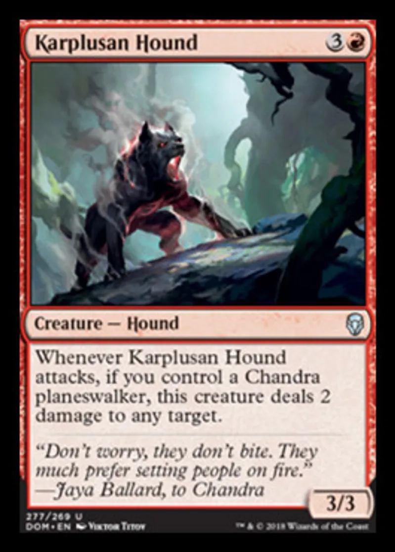 | Oracle Text | Whenever Karplusan Hound attacks, if you control a Chandra planeswalker, this creature deals 2 damage to any target. | ||
