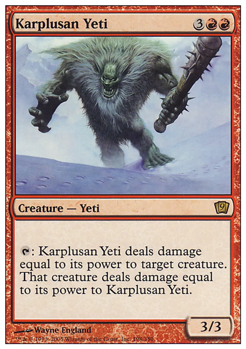 | Oracle Text | {{t}}: Karplusan Yeti deals damage equal to its power to target creature. That creature deals damage equal to its power to Karplusan Yeti. | ||