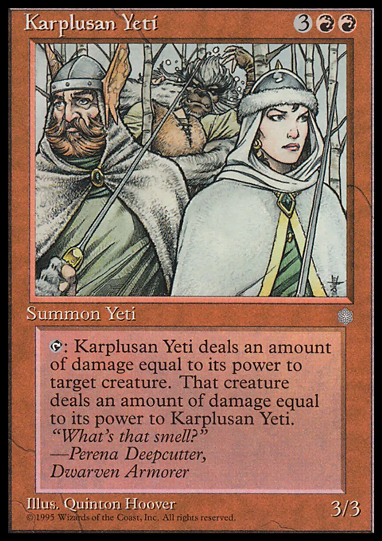| Oracle Text | {{t}}: Karplusan Yeti deals damage equal to its power to target creature. That creature deals damage equal to its power to Karplusan Yeti. | ||