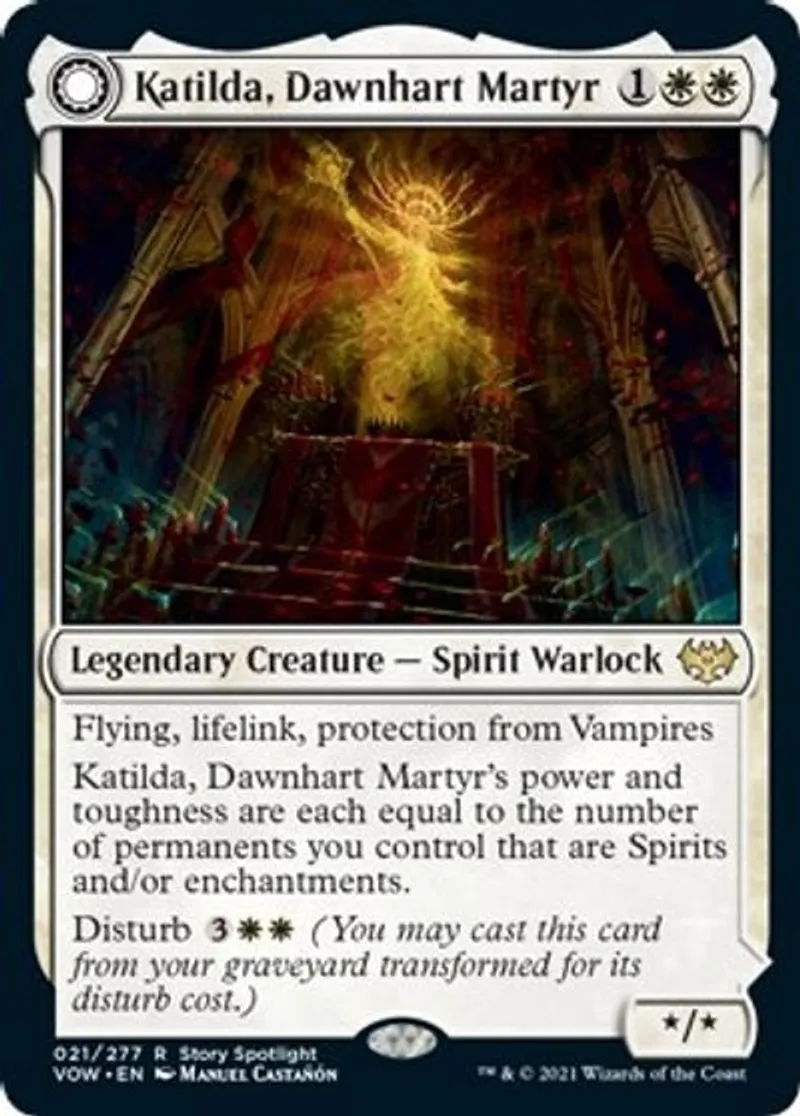 Magic: the Gathering (mtg) Rare Legendary Creature — Spirit Warlock // Legendary Enchantment — Aura Katilda, Dawnhart Martyr from Innistrad: Crimson Vow (vow) last updated 2026-02-25 15:34:02