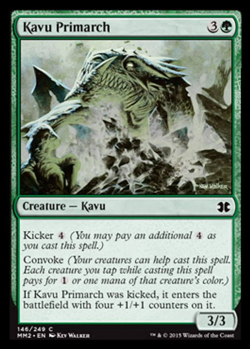 | Oracle Text | Kicker {{4}} (You may pay an additional {{4}} as you cast this spell.) Convoke (Your creatures can help cast this spell. Each creature you tap while casting this spell pays for {{1}} or one mana of that creature's color.) If Kavu Primarch was kicked, it enters the battlefield with four +1/+1 counters on it. | ||