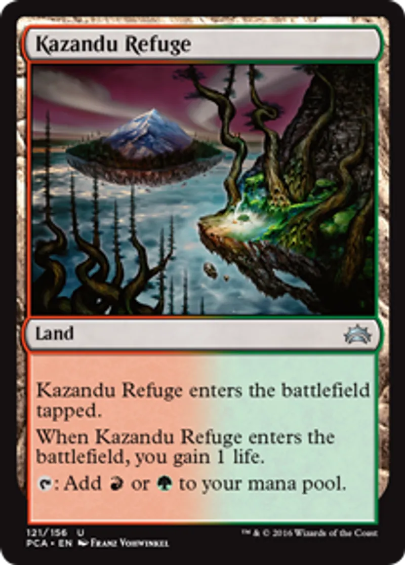 | Oracle Text | Kazandu Refuge enters the battlefield tapped. When Kazandu Refuge enters the battlefield, you gain 1 life. {{t}}: Add {{r}} or {{g}} to your mana pool. | ||