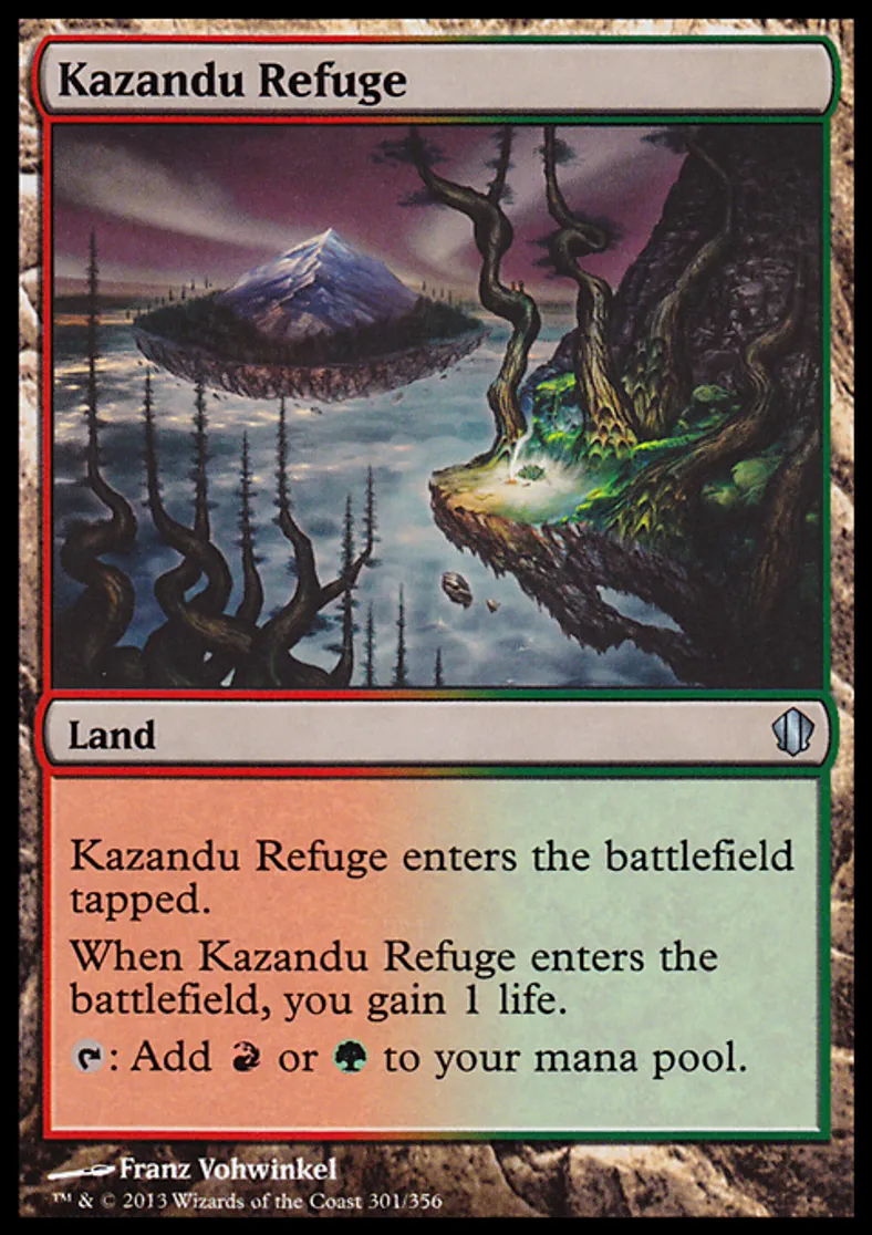 | Oracle Text | Kazandu Refuge enters the battlefield tapped. When Kazandu Refuge enters the battlefield, you gain 1 life. {{t}}: Add {{r}} or {{g}} to your mana pool. | ||