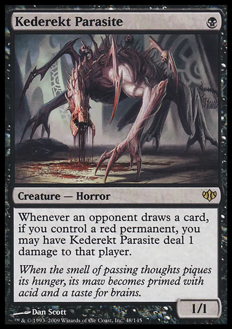 | Oracle Text | Whenever an opponent draws a card, if you control a red permanent, you may have Kederekt Parasite deal 1 damage to that player. | ||