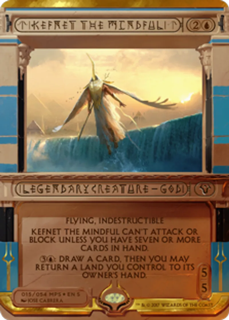 | Oracle Text | Flying, indestructible Kefnet the Mindful can't attack or block unless you have seven or more cards in hand. {{3}}{{u}}: Draw a card, then you may return a land you control to its owner's hand. | ||