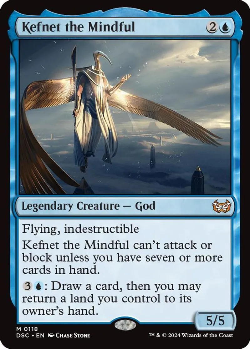 | Oracle Text | flying, indestructible kefnet the mindful can't attack or block unless you have seven or more cards in hand. 3u: draw a card, then you may return a land you control to its owner's hand. | ||