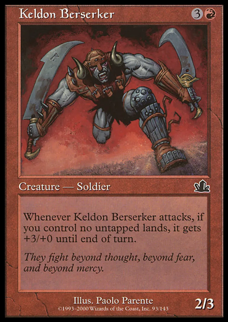 | Oracle Text | Whenever Keldon Berserker attacks, if you control no untapped lands, it gets +3/+0 until end of turn. | ||