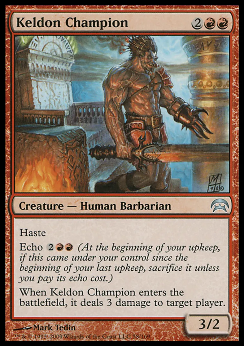| Oracle Text | Haste Echo {{2}}{{r}}{{r}} (At the beginning of your upkeep, if this came under your control since the beginning of your last upkeep, sacrifice it unless you pay its echo cost.) When Keldon Champion enters the battlefield, it deals 3 damage to target player. | ||