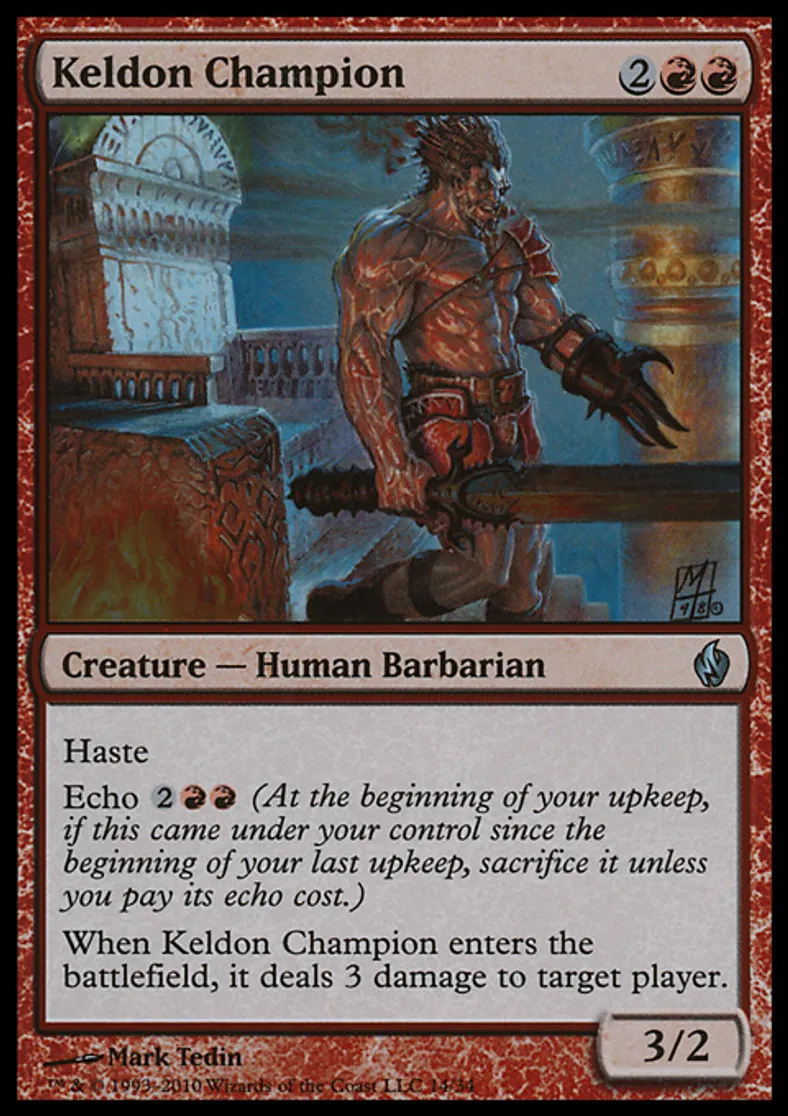 | Oracle Text | Haste Echo {{2}}{{r}}{{r}} (At the beginning of your upkeep, if this came under your control since the beginning of your last upkeep, sacrifice it unless you pay its echo cost.) When Keldon Champion enters the battlefield, it deals 3 damage to target player. | ||