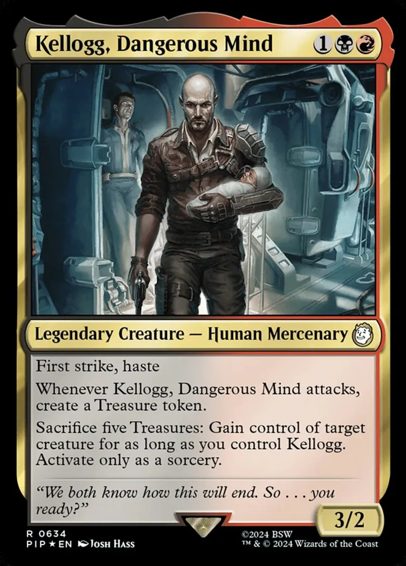 Magic: the Gathering (mtg) rare Legendary Creature — Human Mercenary Kellogg, Dangerous Mind from Universes Beyond: Fallout (pip) last updated 2025-12-13 14:23:32
