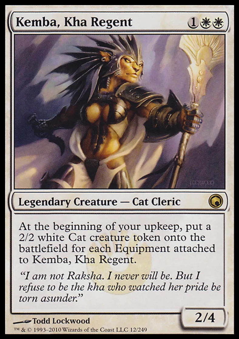 | Oracle Text | At the beginning of your upkeep, put a 2/2 white Cat creature token onto the battlefield for each Equipment attached to Kemba, Kha Regent. | ||