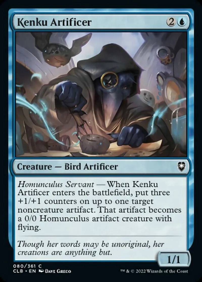 | Oracle Text | Homunculus Servant — When Kenku Artificer enters the battlefield, put three +1/+1 counters on up to one target noncreature artifact. That artifact becomes a 0/0 Homunculus artifact creature with flying. | ||