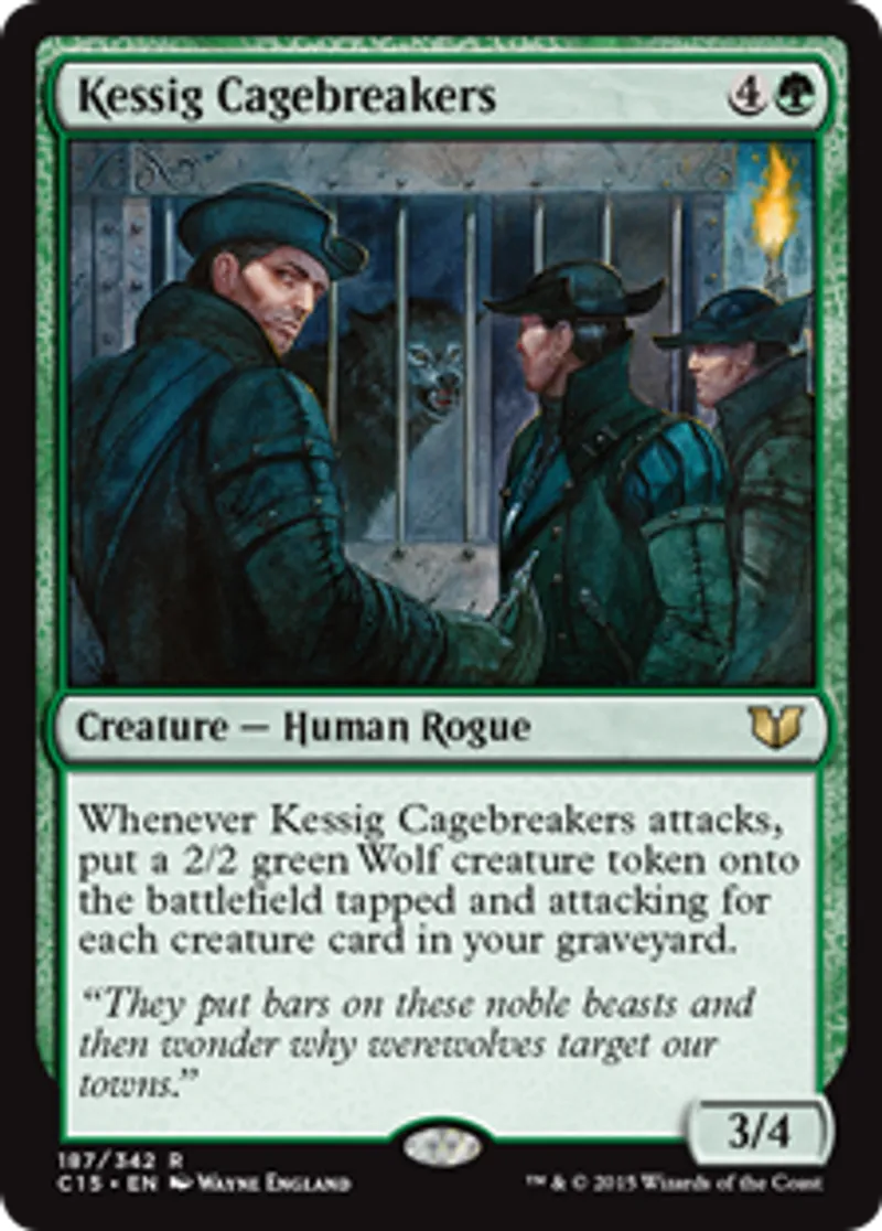 | Oracle Text | Whenever Kessig Cagebreakers attacks, put a 2/2 green Wolf creature token onto the battlefield tapped and attacking for each creature card in your graveyard. | ||