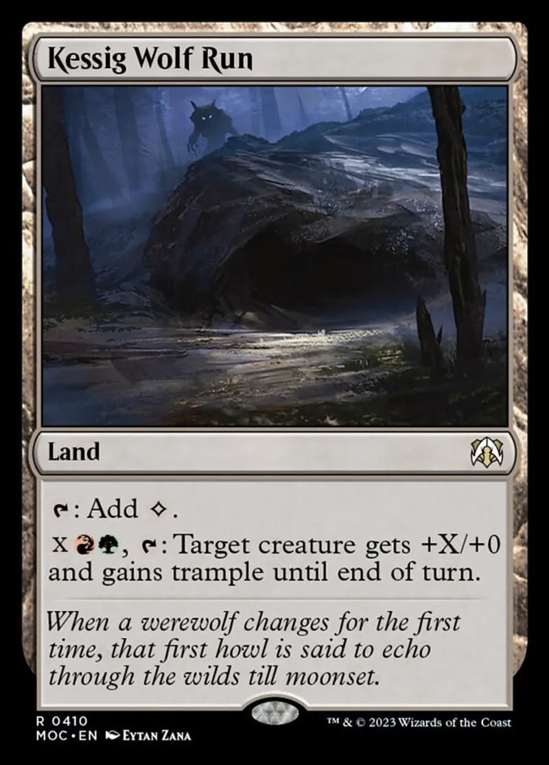 Magic: the Gathering (mtg) rare Land Kessig Wolf Run from March of the Machine Commander (moc) last updated 2026-02-24 15:42:32