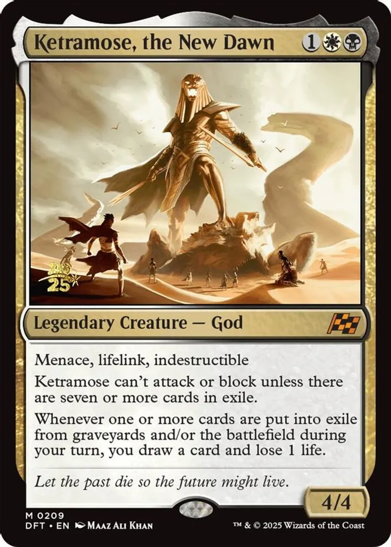 | Oracle Text | menace, lifelink, indestructible ketramose can't attack or block unless there are seven or more card in exile. whenever one or more cards are put into exile from graveyards and/or the battfield during your turn, you draw a card and lose 1 life. | ||
