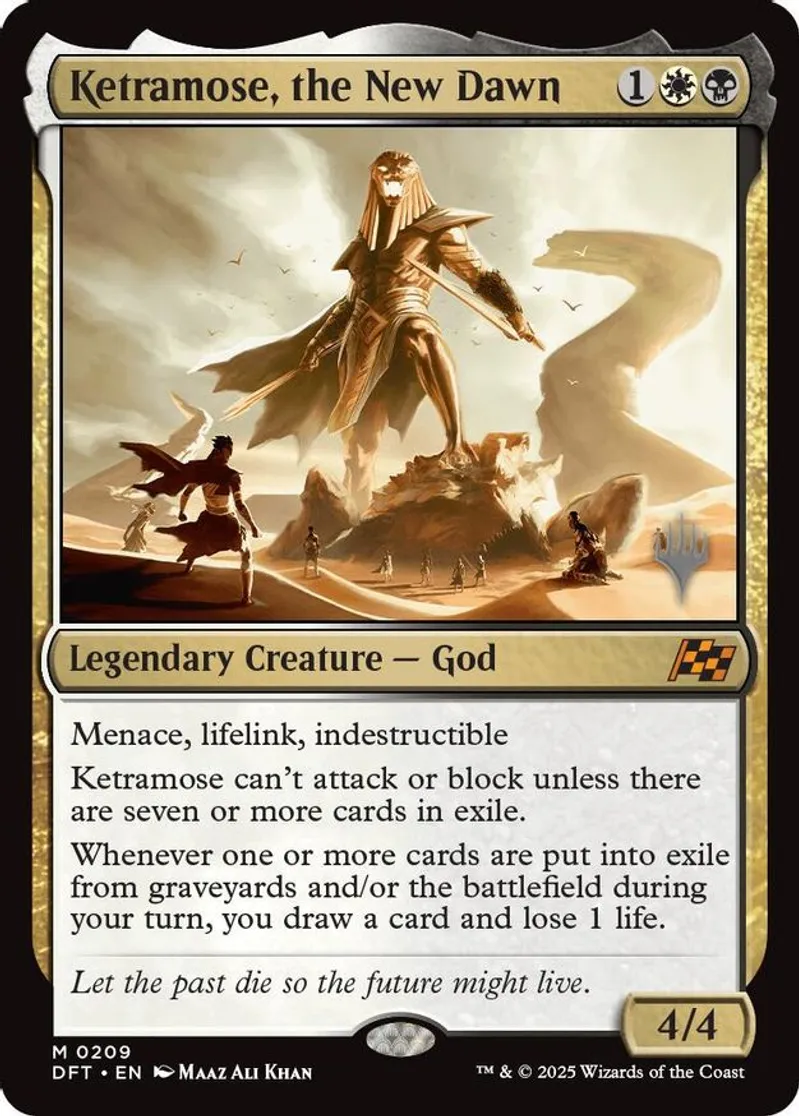 | Oracle Text | menace, lifelink, indestructible ketramose can't attack or block unless there are seven or more card in exile. whenever one or more cards are put into exile from graveyards and/or the battfield during your turn, you draw a card and lose 1 life. | ||